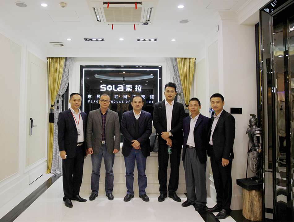 2015年12月4日,田禾集團公司段總一行蒞臨我司洽談合作事宜,董事長馬輝先生親自率領(lǐng)索拉銷售部一干人等進行了熱情接待,并帶領(lǐng)來賓參觀索拉家居物聯(lián)網(wǎng)展廳。